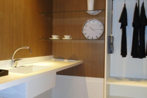 Na área da suíte, com 2,83 m�, idealizada por Robson Gonzales, o módulo de referência (0,80 x 1,20 m) foi obedecido, respeitando os parâmetros estipulados pela NT 9050. A bancada é suspensa e tem seu topo a 0,85 m e a base a 0,73 m. O armário tem acionamento pneumático facilitando o morador a retirar e colocar as roupas sem dificuldades.